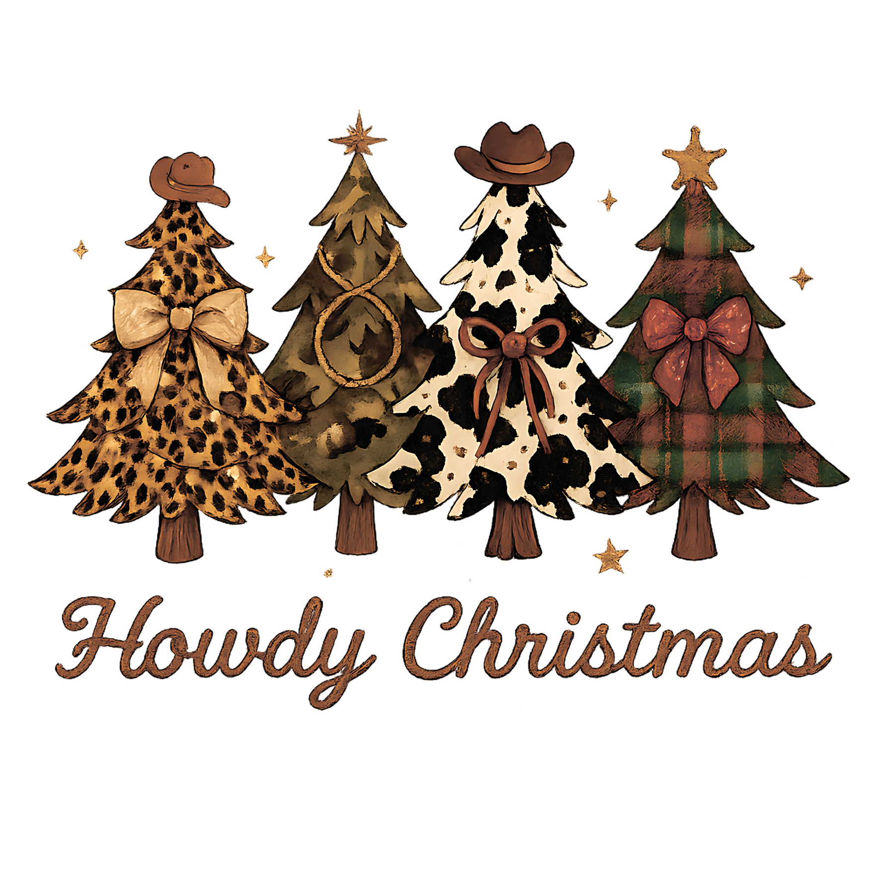 The Howdy Christmas Crew sweatshirt features four Western-styled Christmas trees with unique patterns and accessories, complemented by a cursive Howdy Christmas phrase.
